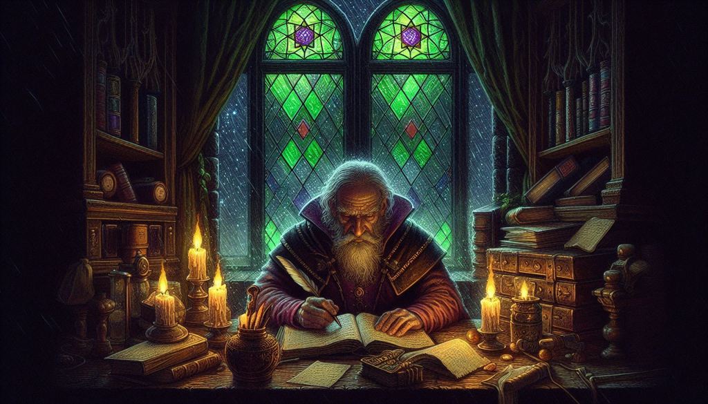 J’indiquais alors au vieux Demi-Elfe le but de ma visite, tout en observant le mobilier en désordre de la petite maison au caractère douillet. Elle était encombrée de dizaines de livres épais et jaunis, qui avaient trouvé place à même le sol, après avoir envahi table et bureau comme du lierre Elfique. Lorsque celui-ci compris que je venais pour écouter l’une de ses histoires et non acheter un parchemin de magie, son regard s’illumina :