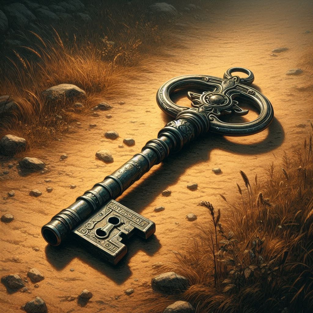 Une vieille clé en fer trouvée sur le sol poussiéreux d’un chemin de terre. Elle possède de jolies gravures, laissant penser qu’il ne s’agit pas d’une clé quelconque.