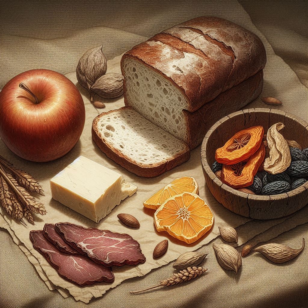 Une ration de voyage composée d’un morceau de pain, de viande séchée, d’un tranche de fromage et de quelques fruits secs. Utile pour bivouaquer lorsque aucune taverne n’est à l’horizon, mais cela reste frugal.