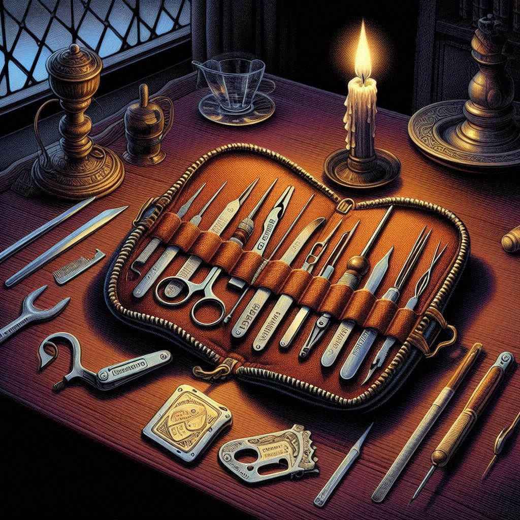 Un kit contenant un ensemble de tiges métalliques et d’épingles de différentes formes, destinées à crocheter des serrures non magiques.