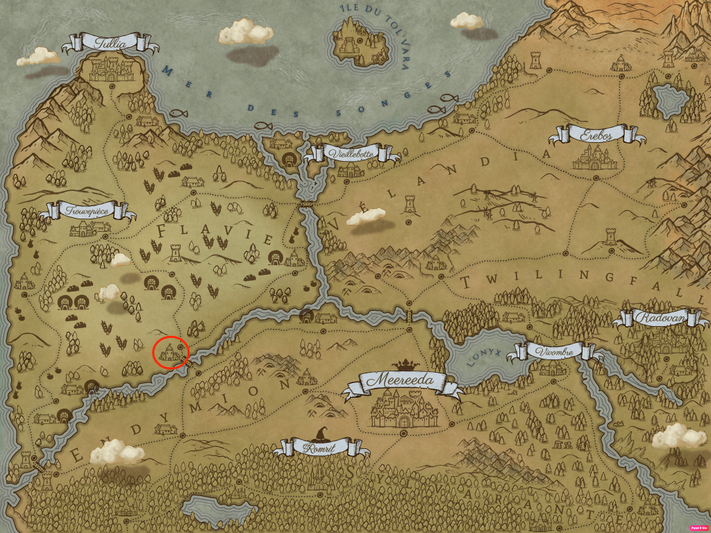 Pont de Lune est un petit bourg d’environ 600 habitants situé au Sud de la Flavie, sur le rivage Nord du Fleuve aux Rubans. Il est placé sur un petit affluent du fleuve, la Rivière des Souhaits. Le village est construit autour d’un petit pont en pierre qui surplombe la Rivière des Souhaits.